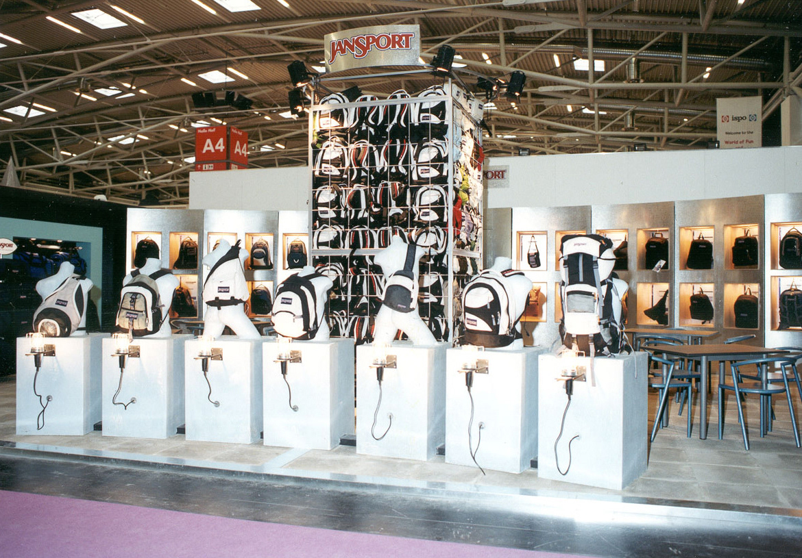 Jansport needed a feature booth to launch a new range of bags at ISPO. The same booth needed to be able to travel to other expo sites of varying sizes over the next two years. My solution was to create a rear wall of hinged aluminium panels, the radius of which can be adjusted to the size of the space. The second year at ISPO the central tower was covered to highlight the single Airzuit bag that Jansport was promoting, which was displayed in a custom retail display that was mass produced to be installed in 200 stores across Europe. Client: Event Creatives - 2000/2001
